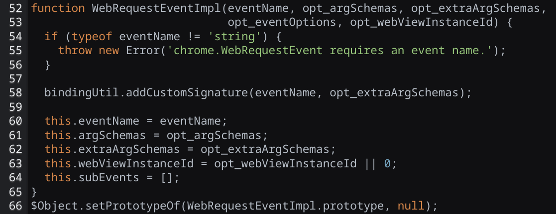 Instead of doing pure bindings between JS and C++, the browser creates one of these classes for every chrome.webRequest event: onBeforeRequest, onCompleted, etc. Surprisingly, the .constructor of these events is still public. It points to yet another wrapper class, which internally calls WebRequestEventImpl (from the code above). You can use this to can create a new event with your own properties: